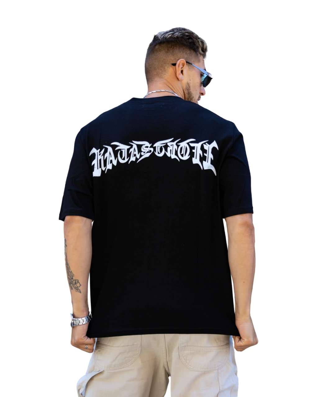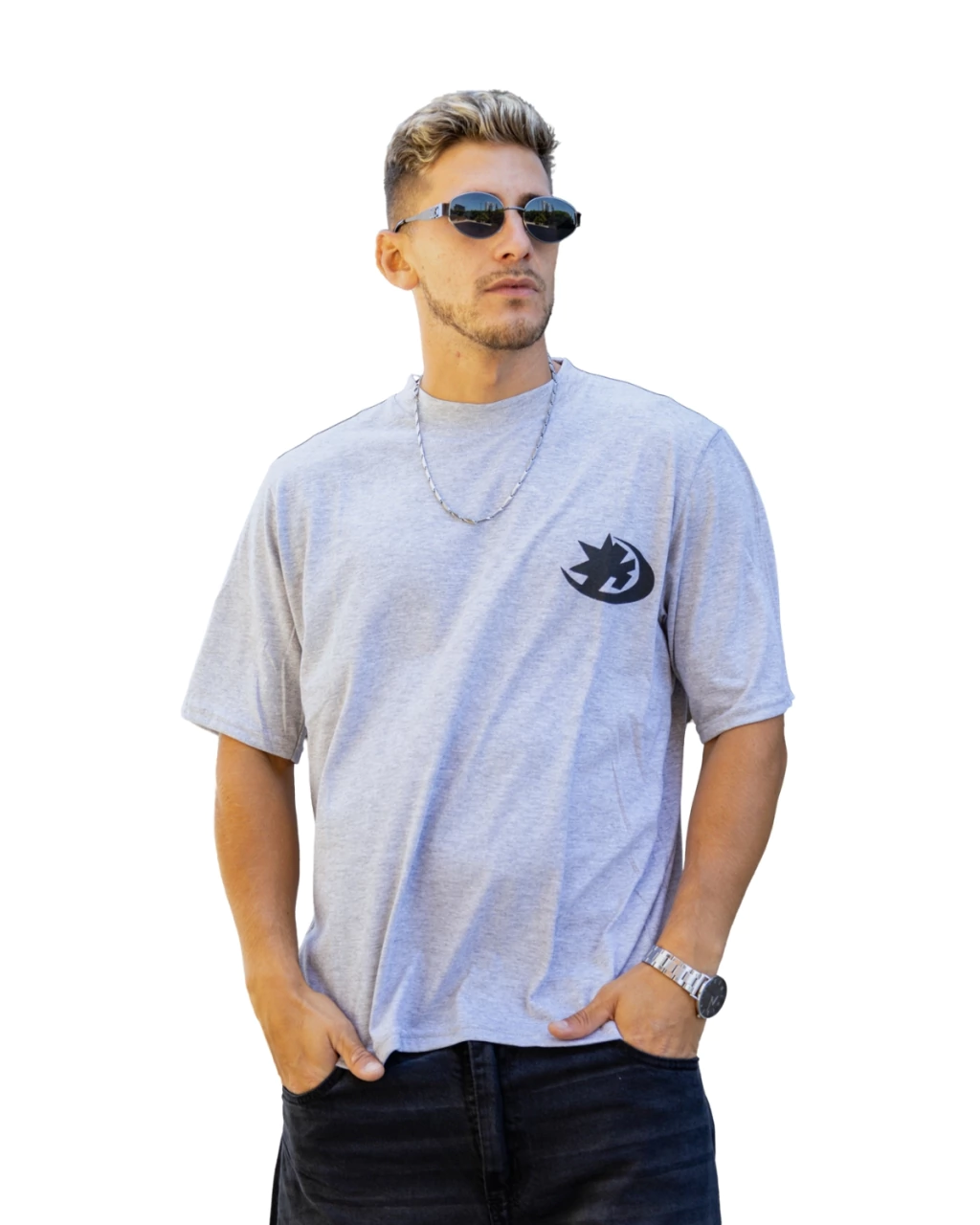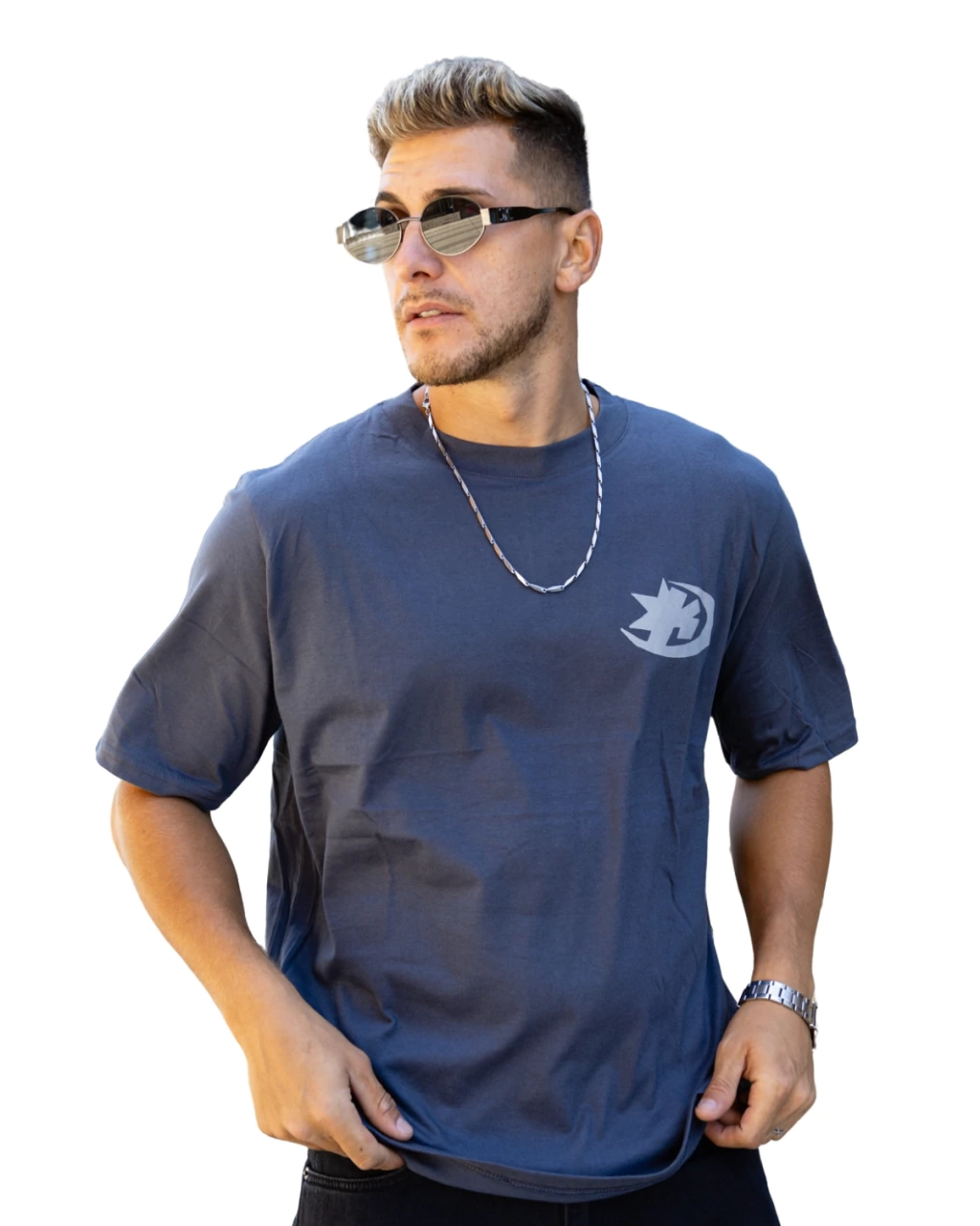 Frente limpio con logo filoso y espalda que rompe con estilo.
